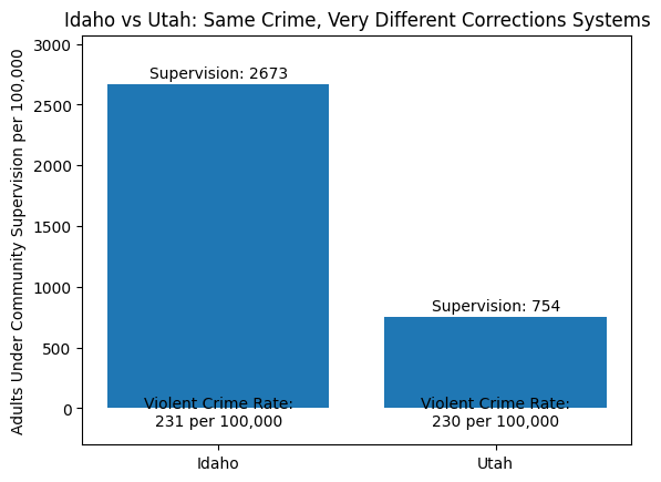 If Idaho and Utah experience nearly identical violent-crime rates, why does Idaho keep so many more people under correctional supervision and behind bars?